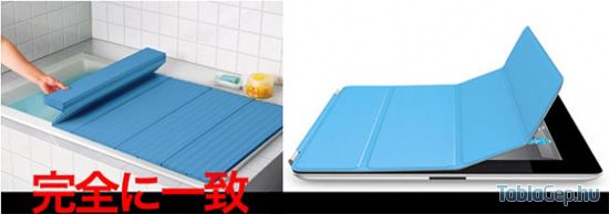 Az Incase terméke ugyanúgy hajtogatható, mint az Apple okos borítója, csak nincs benne a mágnes. A fenti japán szöveg jelentése igaznak tűnik, hogy “teljesen egyformák”. Lehet, hogy sosem tudjuk meg, valóban a szappanos fürdőkád takaró ihlette-e a tervezőket.