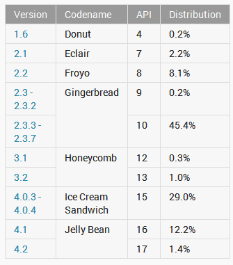 A vezető szerepet az Android 2.3 birtokolja, ami az eddig felsoroltak között a legöregebb kiadás. A több mint 2 évvel ezelőtt megjelent Android az egyik legjobban sikeredett verzió, amiről a népserűsége tanúskodik. Még jelenleg is rengeteg ilyen rendszert futtató okostelefont adnak el, mivel az olcsóbb modellek között, még bőven ráakadhatunk Gingerbreades gépekre. A korábbi kiadások viszont mostanra eltűntek, egyedül az Android 2.2 FroYo az, aminek még mérhető piaca van, ez a mobilok 8,1 százalékán dolgozik.